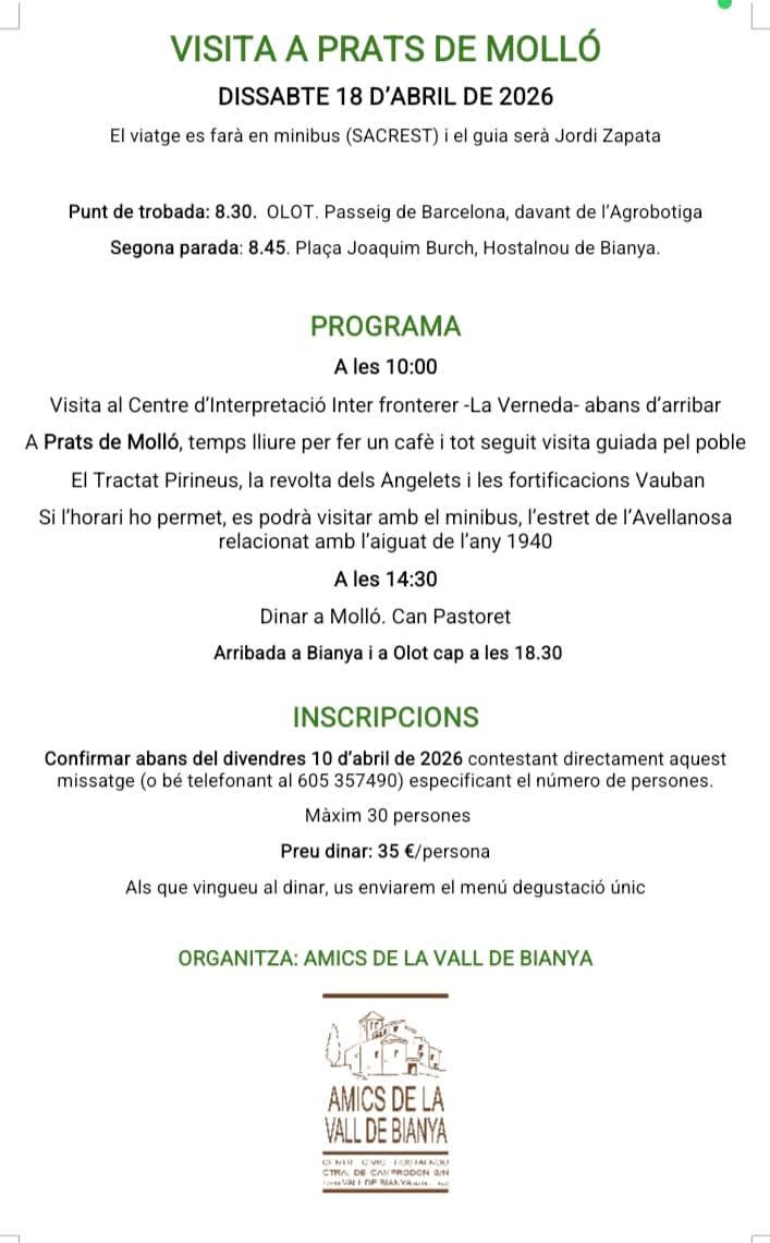 Dissabte, 18 d'abril, visita cultural amb dinar a Prats de Molló
